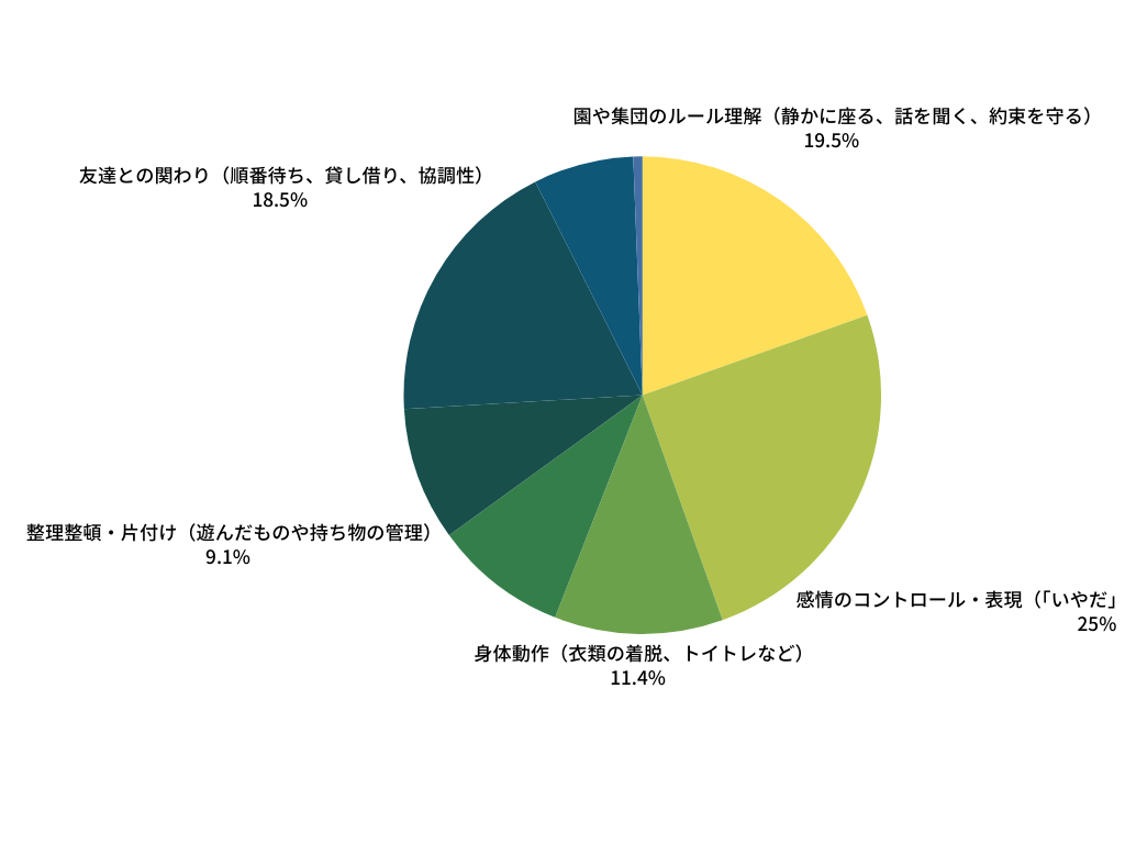 感情のコントロール、トイトレなどの身体動作、お友達との関わりなど、習得が難しい習慣が多く選ばれました。乳幼児期のみならず、小学校入学後にもつながる大切な要素ばかりですね。